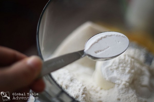 - In the bowl of a food processor fitted with dough blade, add flour, sugar and baking powder. Pulse to combine.
