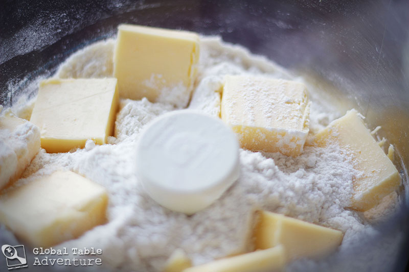 Next, add hunks of butter and pulse until pea sized pieces form.