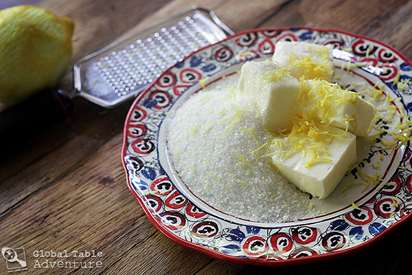To do this, cream together the butter, sugar and lemon zest in the bowl of a standing mixer.