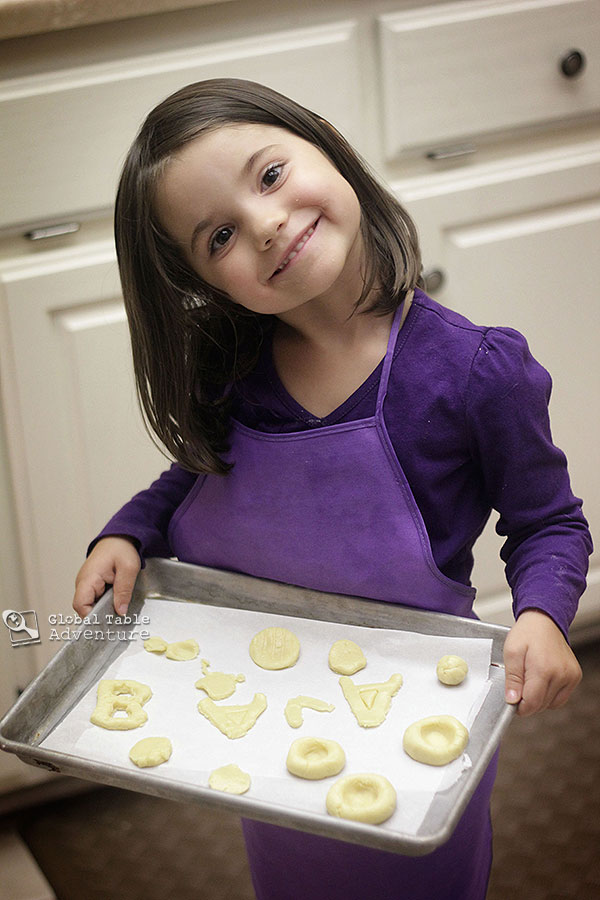 The dough is a dream for kids to work with… since it’s mostly butter, there’s no sticky hands to deal with. I simply gave her smidge of dough, and she went to work making silly shapes.  While she rolled and rerolled her dough half a million times, I was amazed to find that her cookies came out just as tender as mine (thanks to the light texture from the corn starch).