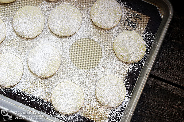 5. Bake 12-14 minutes, or until puffed. For nice, soft cookies you won’t want them to brown. Remove them from oven and cool on a cookie rack. Dust with a snowfall of powdered sugar once completely cool.