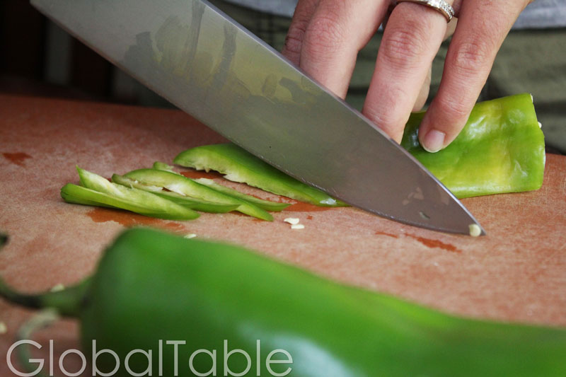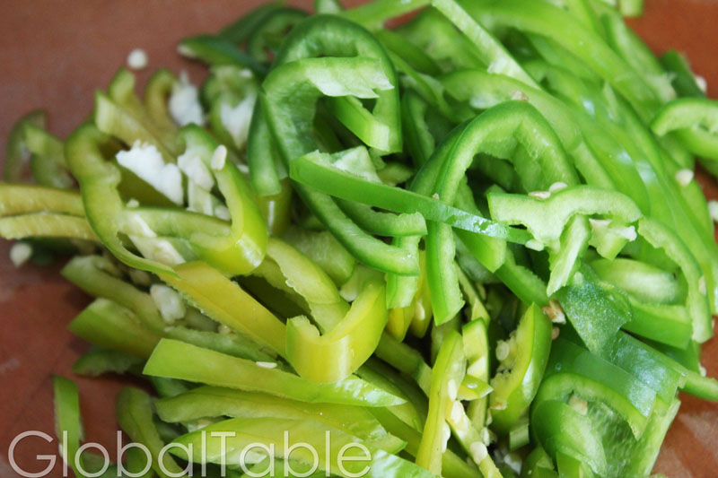 - Slice peppers into strips, removing seeds if desired.
