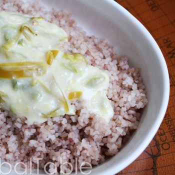 Ema Datshi is considered the national dish of Bhutan and it’s traditionally screaming hot! Use whatever chili peppers you like, from mild poblano, to scorching thai bird chilies. My blend of Anaheim and Serrano chilies is very hot, but you can reduce the heat by leaving out the seeds. In Bhutan they serve Ema Datshi over rice (pictured here with cracked red rice). My husband likes dipping corn chips into the cheesy goodness. I’d like to tell you he’s a fool but, really, the combination was excellent.