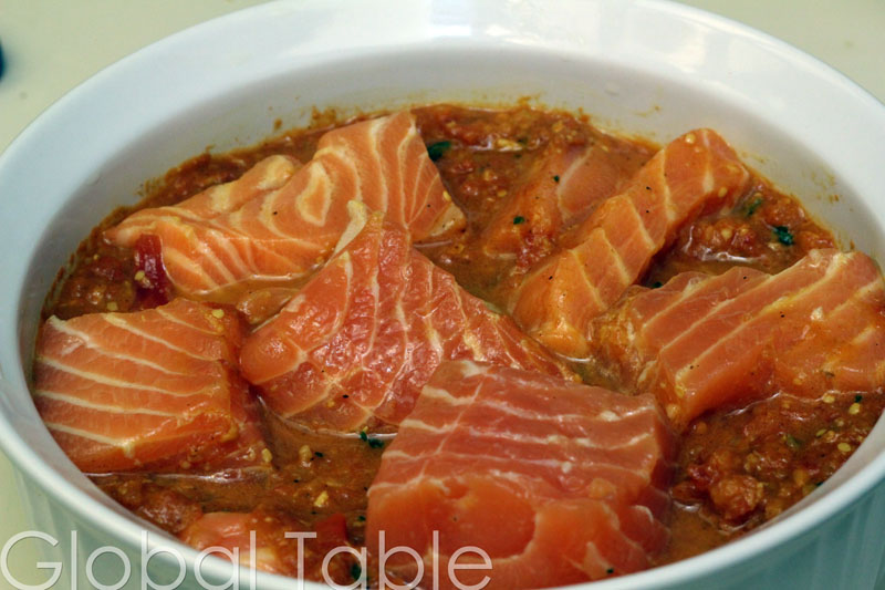 We made this flavorful dish with salmon which became incredibly tender after an overnight marinade and gentle steaming. Although not very spicy, the mustard sauce reminds me of wasabi.