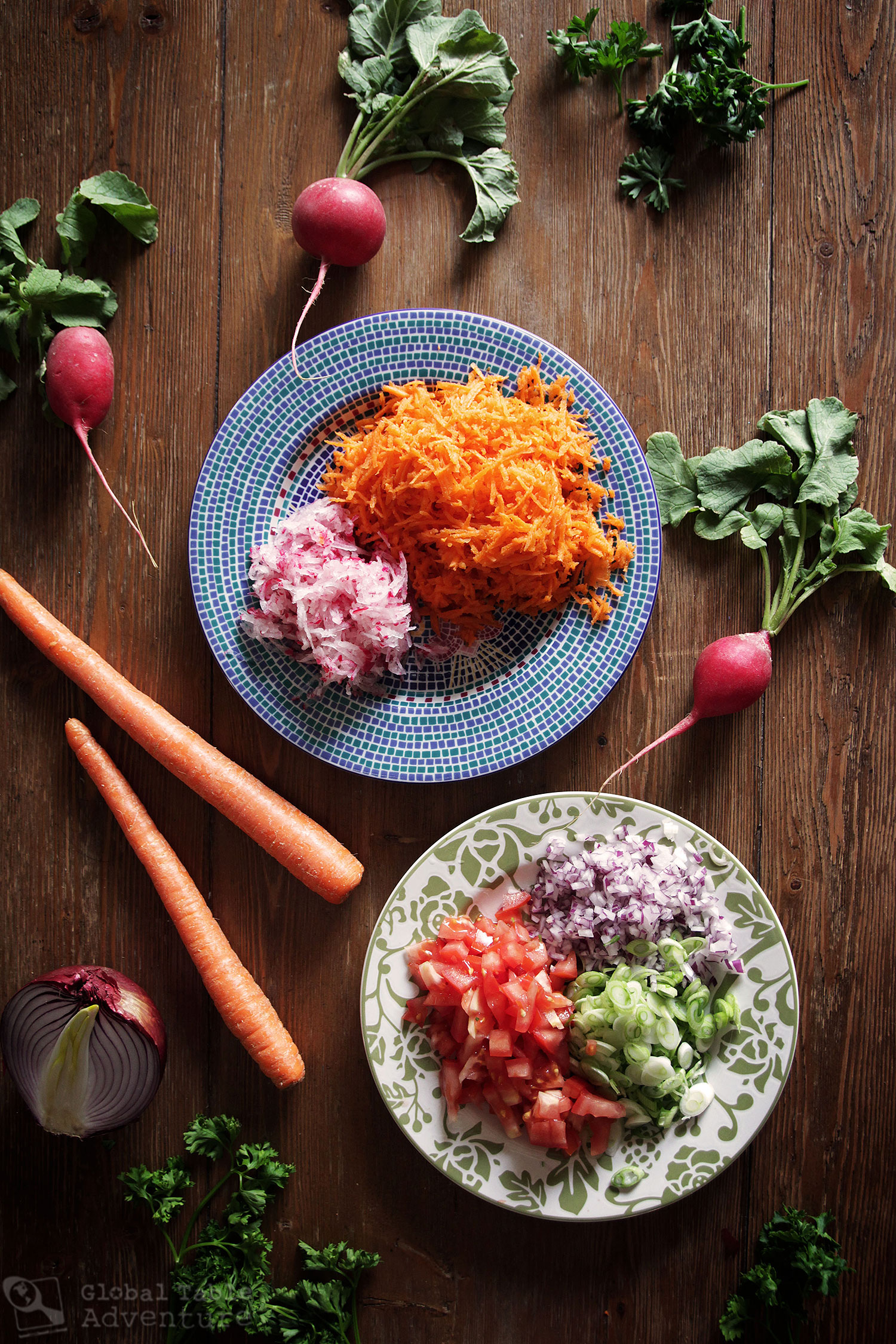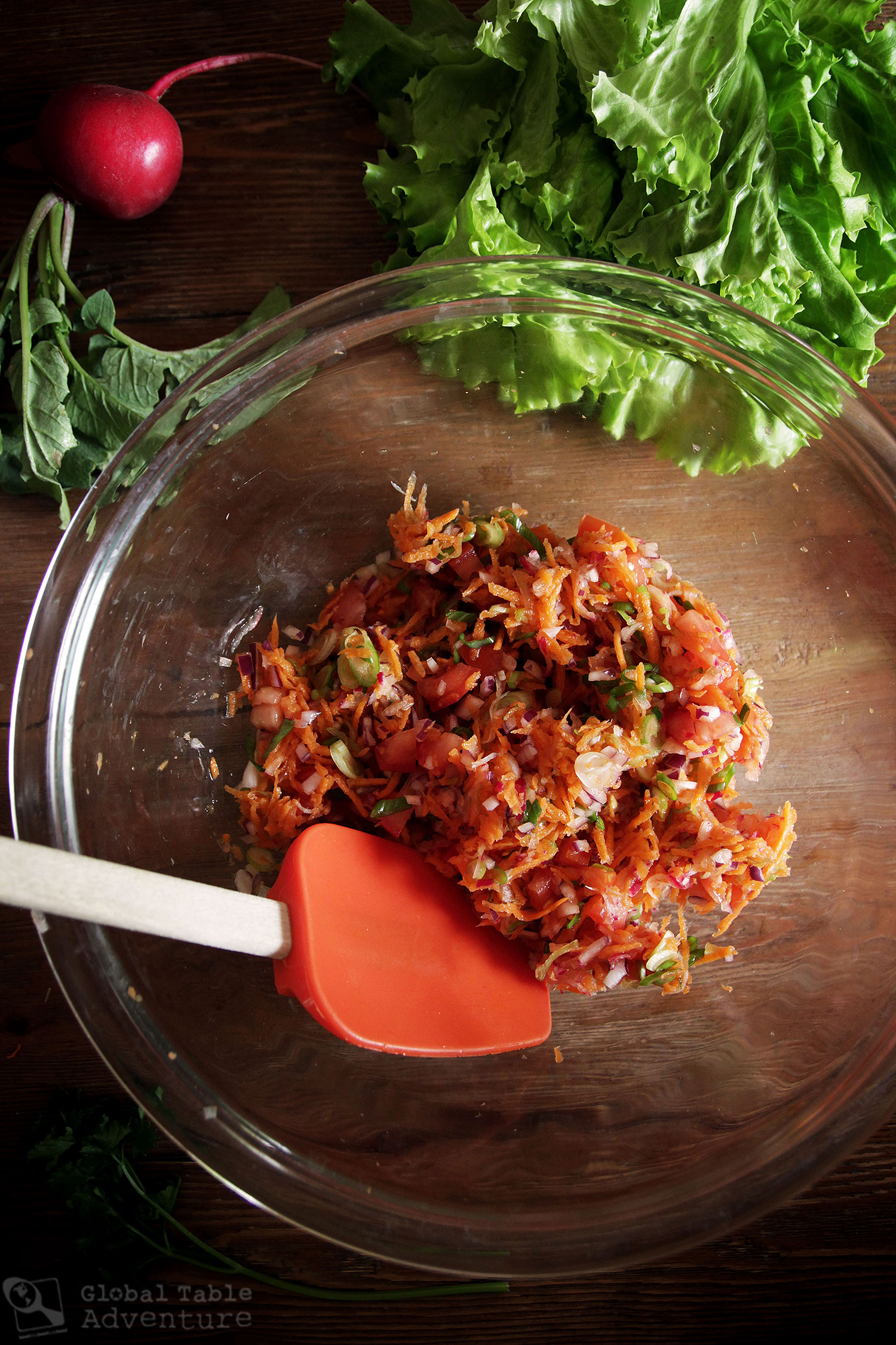 There’s a garden’s-worth of fresh vegetables in the dish, including spicy radish, chopped tomato, sweet slivers of carrot, and bright green onion bits.