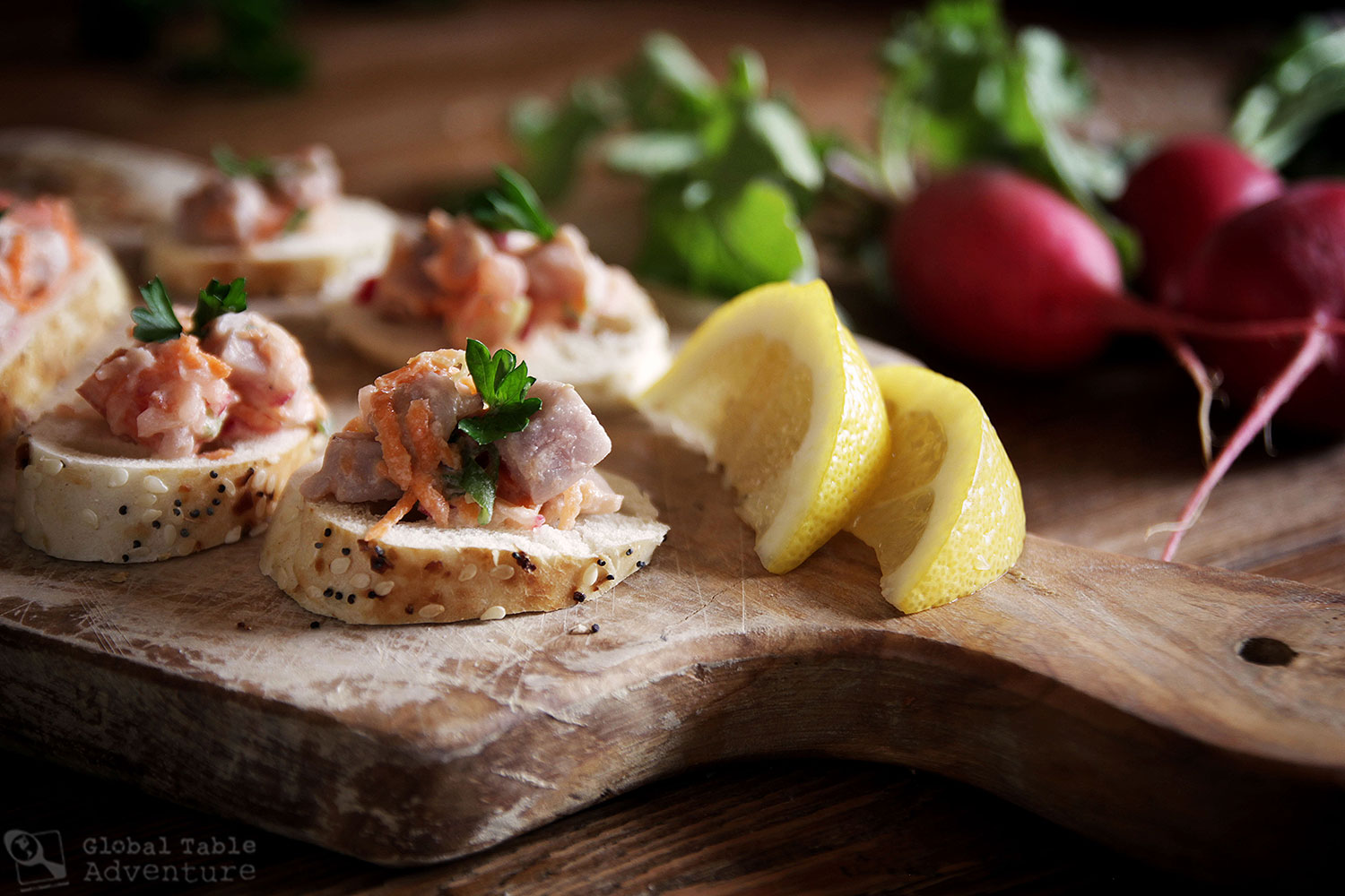 While I've used tuna here, you can also use grouper or snapper. You can easily make 75 small appetizers on crostini or serve 6 people a good, lunch-sized portion.