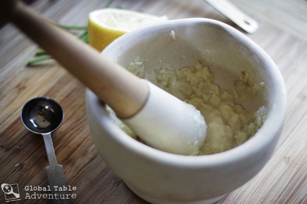 First, you have to get the garlic started. You can crush it with a garlic crusher, or chop, chop, chop it, or pound it with some salt with a mortar and pestle.