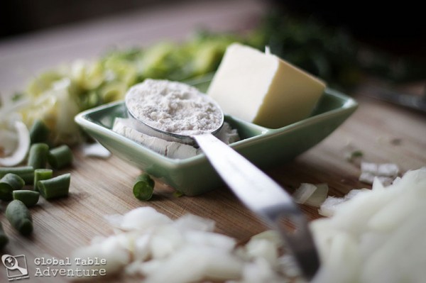 Now, melt the butter in a large pot and whisk in the flour, until a smooth paste forms (a light roux) – cook for about a minute. Do not let color.