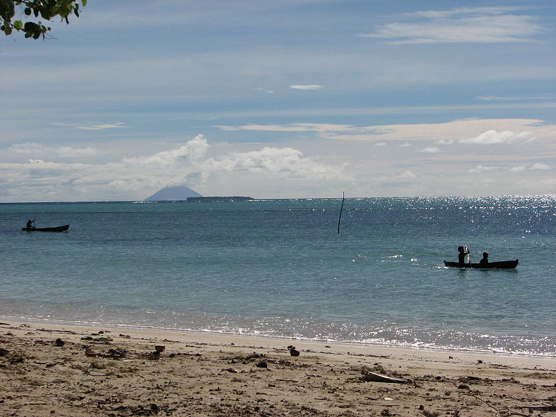 Looking towards the Great Reef from Fenualoa, Reef Islands, Solomon Islands. Active volcano Tinakula across the waters. Photo by Pohopetch.