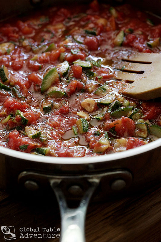 - Fry the zucchini and garlic in olive oil until slightly browned. Add on the chili flakes, herbs, diced tomatoes, salt and pepper. A splash of vinegar brightens up the flavor. Simmer uncovered for just ten minutes.