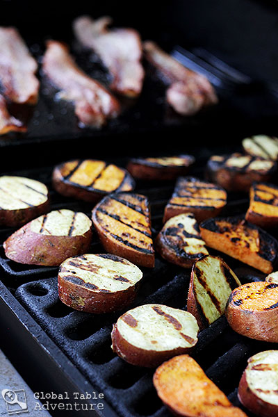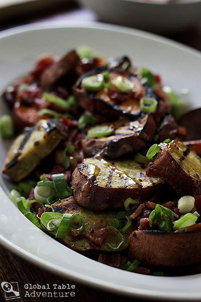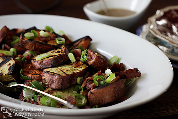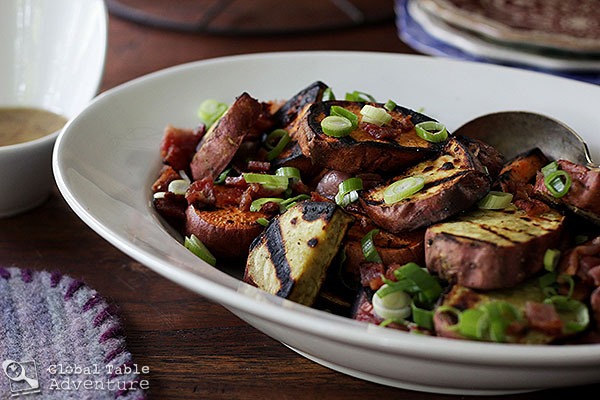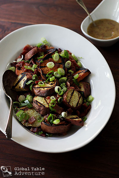 Today’s salad takes inspiration from New Zealand’s love of barbecue. For color I combined two kinds of sweet potatoes on the grill before tossing them with bacon, green onion, and a quick, zingy honey mustard dressing.