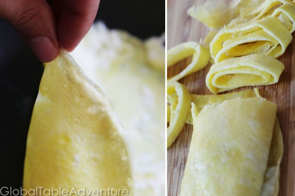 - Next, beat two eggs and cook in a large pan with some oil, making a very thin omelet, almost like a crepe. Roll into a tube and cut into strips.