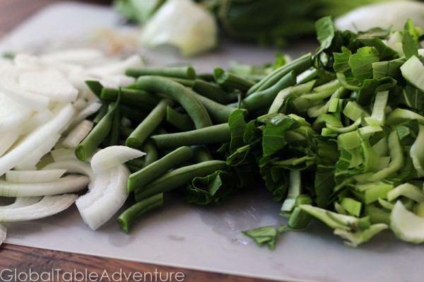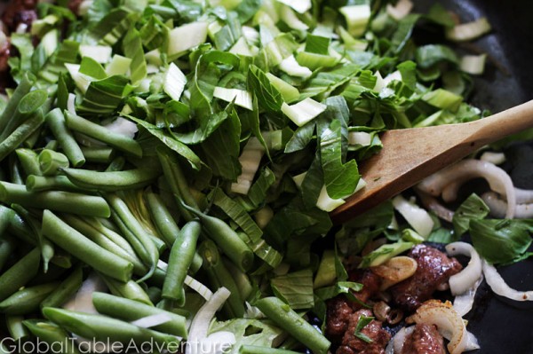 Once you’re sufficiently happy, slice all veggies up – from onions, to green beans, to bok choy. Even cut up the garlic. This is important, because once you start cooking you’re going to be moving at the speed of light.