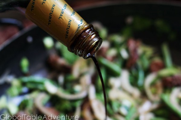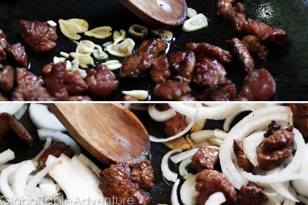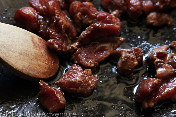 Heat oil in a wok or large skillet up over high heat. Make sure it’s screaming hot. Add meat and stir constantly. It’ll get nice and brown.