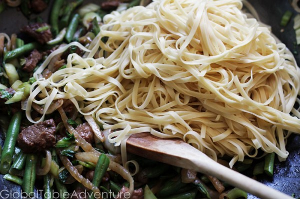 - Toss the noodles on top and give everything a good mix. If it seems a bit dry, loosen it up with a sprinkle of water (or even better, cooking water from the noodles). Remove from heat and set aside.