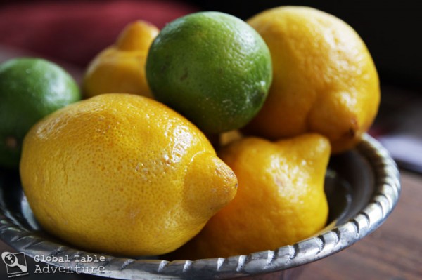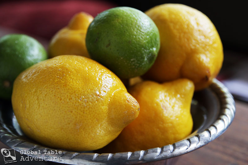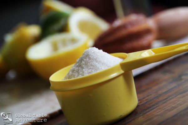 First, squeeze enough lemons and limes to make 1 cup of strained juice.