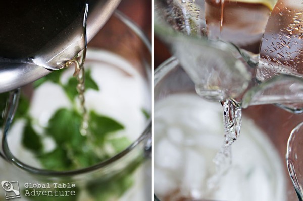 While the sugar dissolves, prepare your pitcher. Add a heap of ice, the lemon/lime juices, and several sprigs of mint.