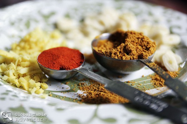 Next, pile on the ginger, garlic, hot paprika and curry. Sweet paprika will work too if you don’t like it spicy.