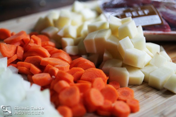 Put on a smile – it’s time to get your chop on. Cut the onion, tomato, carrot, potato, and beef into average hunks.