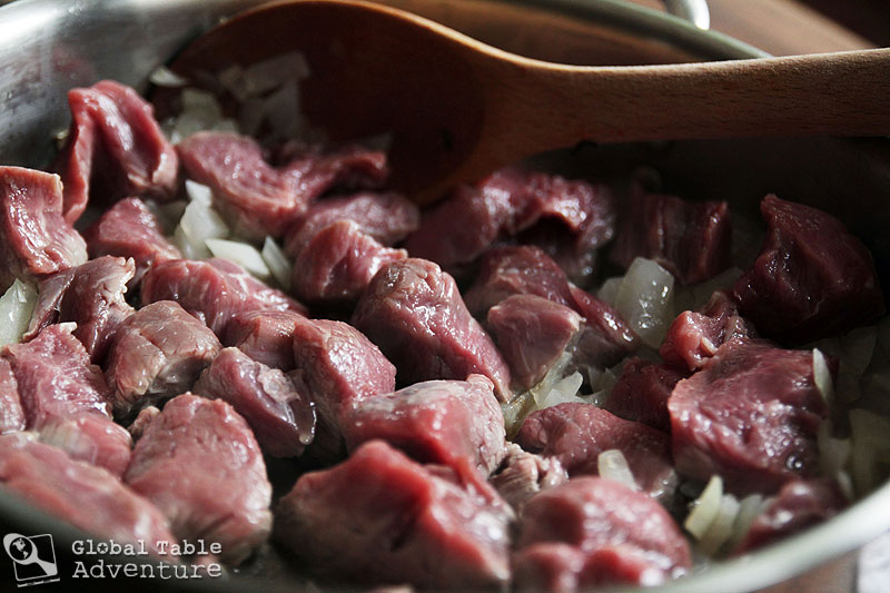 Next, brown the onions in oil over medium heat. Then increase heat to high, add the beef and brown. (Do it in batches if necessary).