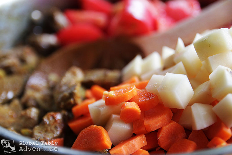 - Cut the onion, tomato, carrot, potato, and beef into average hunks. Next, brown the onions in oil over medium heat. Then increase heat to high, add the beef and brown. (Do it in batches if necessary).
