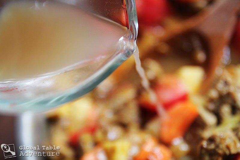 - Next, pile on the ginger, garlic, hot paprika and curry. Sweet paprika will work too if you don’t like it spicy. Now, add the carrots, potatoes, and tomatoes. Splash on the stock. Season with salt. Simmer uncovered until thick and pasty and all broth has reduced away. This took about an hour.