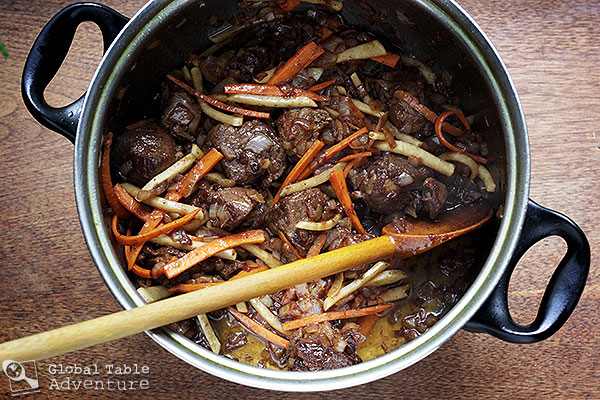 Next, brown the meat in the vegetable oil. The recipe purposefully uses a lot of oil (traditionally, the fat would be from the mutton)… the oil gives the plov authentic, rich flavor that you’ll be craving for years to come.