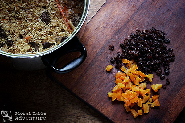 - Add the hot water and rice to the lamb mixture. Simmer 15 minutes uncovered. Then add raisins and quartered dried apricots. Cover and remove from the flame. Let rest this way 10-15 minutes.