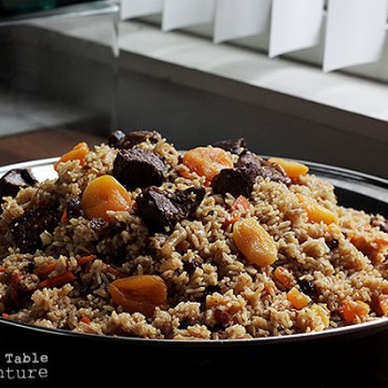 Add the hot water and rice to the lamb mixture. Simmer 15 minutes uncovered. Then add raisins and quartered dried apricots. Cover and remove from the flame. Let rest this way 10-15 minutes.