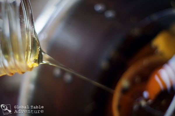 - In a large pot bring the honey and water to a simmer.