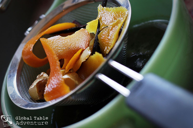 When you’re done, go home and remove the pot from heat. Add the Everclear to the still-hot mixture, stir to combine and then strain the mixture. (Tip: use the spices again to flavor a vanilla ice cream base, chocolate, flan, etc- yummmmm)