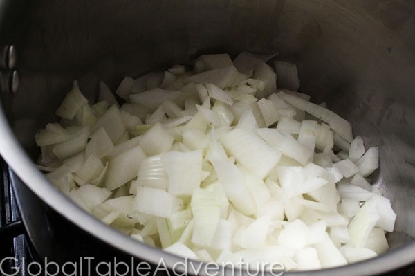First, cook the chopped onions in a large pot until softened.
