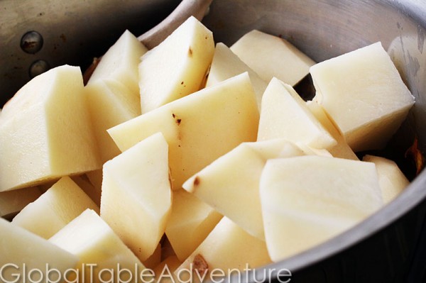 Next, cube up the potatoes and add to the pot. Size doesn’t matter because they’ll be pureed. Just remember, the larger you cut them, the longer they’ll take to cook.