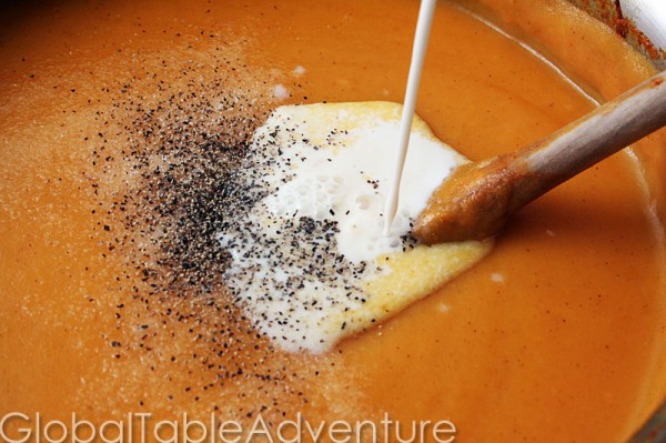 Add enough milk to thin out the soup – it should pour out of the ladle – no plopping soup allowed.