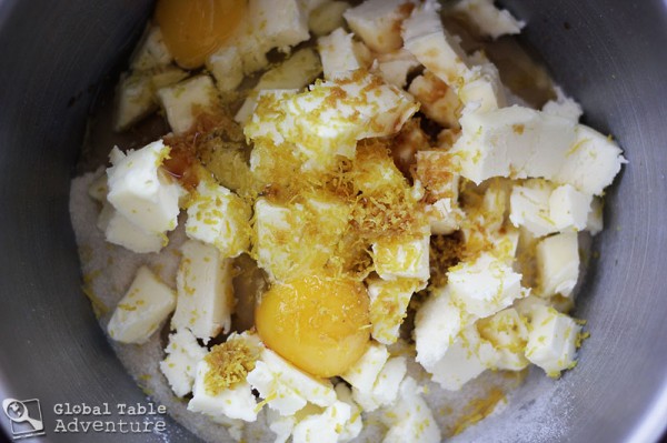 - Add the flour, sugar, butter, eggs, vanilla extract, lemon zest to the bowl of standing mixer. Combine on lowest speed to form a happy, crumbly mass. Scrape sides.