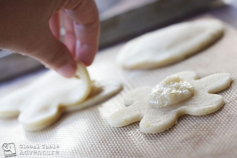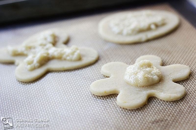 - Add some filling to half the cookies, leaving a lip around the edge. Dab a bit of water along that edge and place second cookie on top. Press together all around the edges to seal. For best results, place cookie sheet in freezer for about 15 minutes to flash-chill the cookie again (this will keep them from spreading too much).