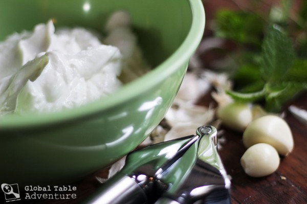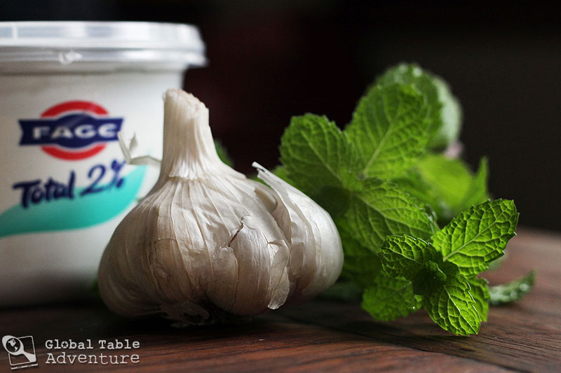 If you happen to live high in the mountains, near a chilly stream, go ahead and dig a refrigerator. Otherwise, keep it simple: mint and garlic from the garden, yogurt from Greece – thick and creamy.