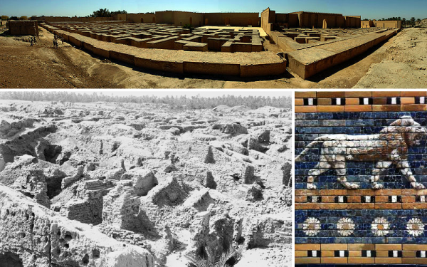 Top: The rebuilt ruins of Babylon, as seen today | Bottom Left: Ruins as they stood in 1932 Right: Part of the reconstructed Ishtar Gate.