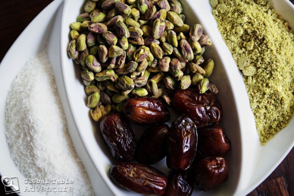 - As a finishing touch, roll the date balls in ground pistachios or shredded coconut. The pistachios coating is more traditional, although the coconut is fun. (Make ground pistachios by pulsing a 1/4 cup in a coffee grinder or food processor.)