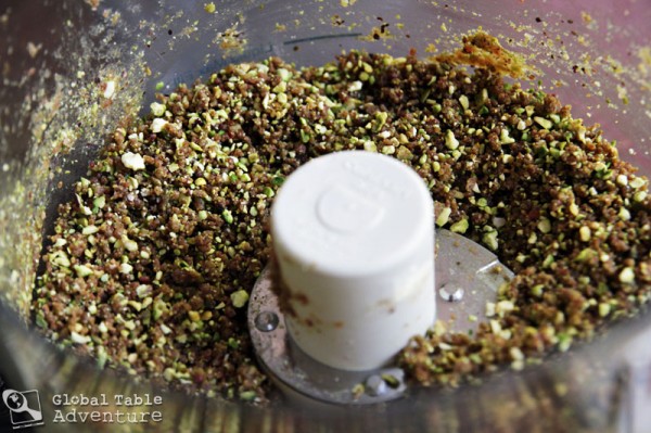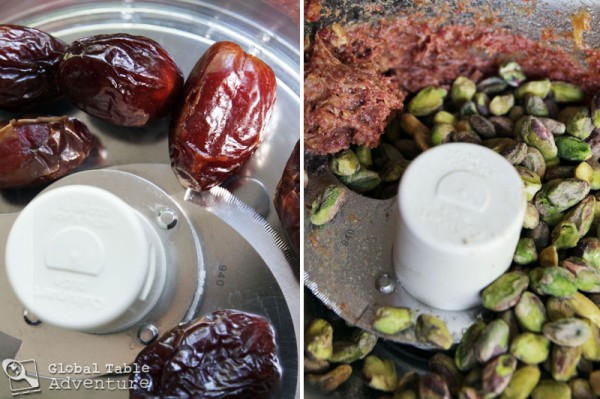 - In a food processor blend the dates into a paste. Add pistachios.