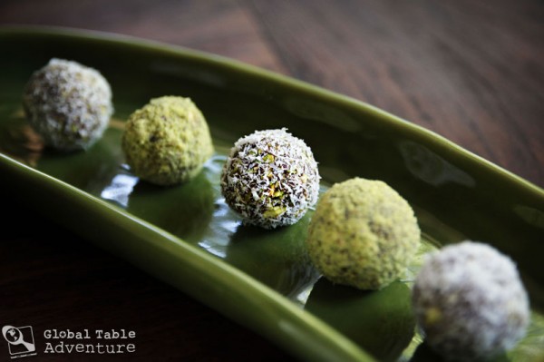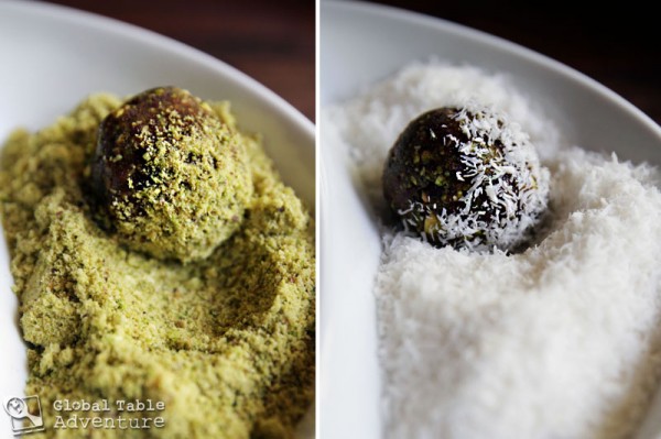 As a finishing touch, roll the date balls in ground pistachios or shredded coconut. The pistachios coating is more traditional, although the coconut is fun.