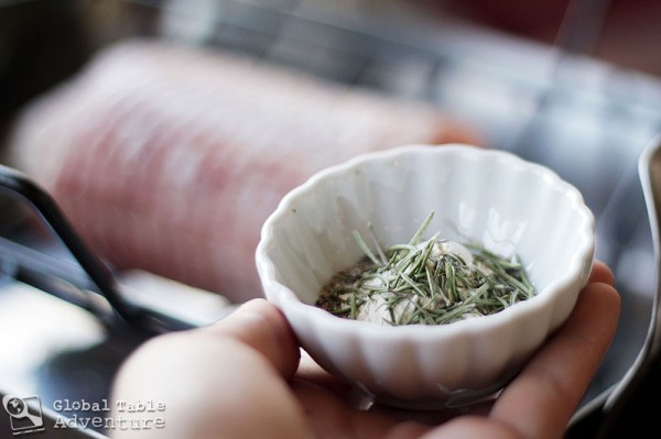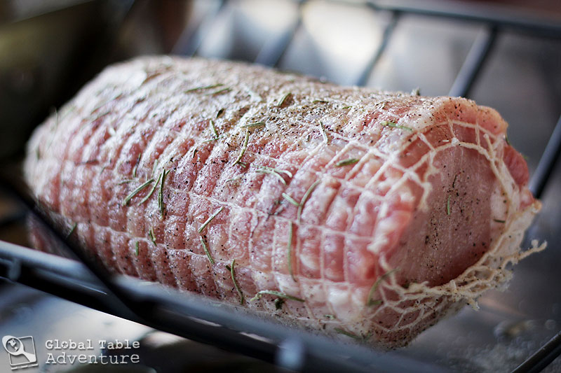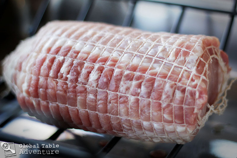Truss the pork, if needed. The one I bought came wrapped up in netting. I highly recommend leaving the netting on; it holds the meat together, plus you’ll end up with pretty marks on the roast (just cut it off before slicing).