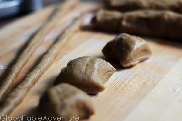 - Cut it into four pieces. Roll each piece into a fat log and cut each log into 4 pieces. Now you have 16 hunks of dough. Not to be confused with 16 hunks, unfortunately. Roll each hunk into a thin rope. See the ones pictured below. They’ll be long. Maybe 18 inches.