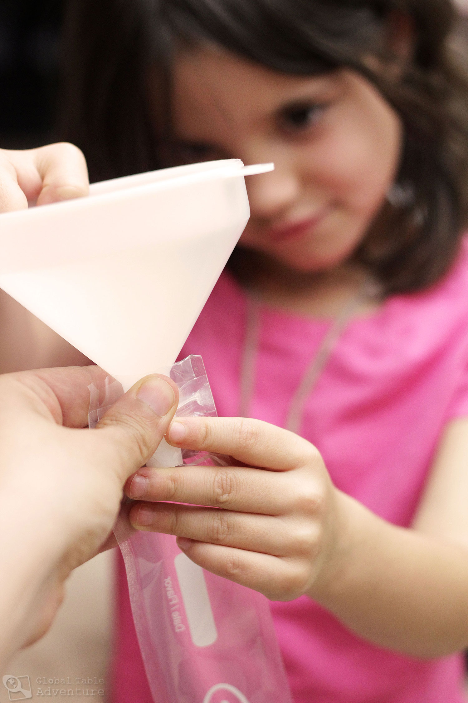 The process is simple enough: blend all the ingredients and strain the seeds out. Then we used a funnel to add the liquid to the narrow bags and zipped them shut.
