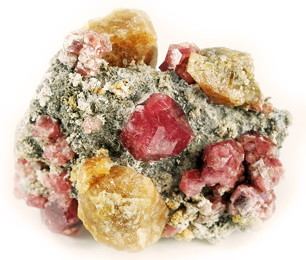 A raspberry-red, compound grossular garnet, surrounded by smaller garnets and tannish-yellow vesuvianite crystals. Found at the Lake Jaco deposit, Mexico. Rob Lavinsky / iRocks.com