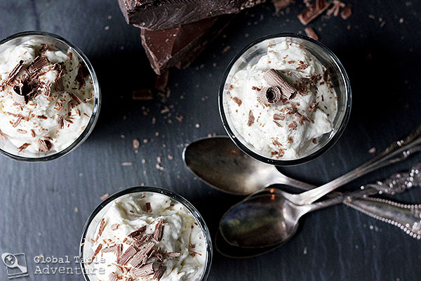 When I first read that bananas are popular in West Africa’s island country São Tomé and Príncipe, I envisioned them eaten raw on the surf-swept beaches… or perhaps sold battered and fried with a cloud of powdered sugar. While all this certainly does happen, I never imagined I’d see them folded inside of a fluffy mousse, decked out with indulgent curls of dark chocolate. But I’m sure glad I did.