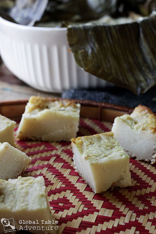 - Get everything smooth and flat, then fold the banana leaves back over the cassava mixture. Cover tightly with a lid or foil and bake at 350F for about 3 1/2 hours… or until browned on the edges.
