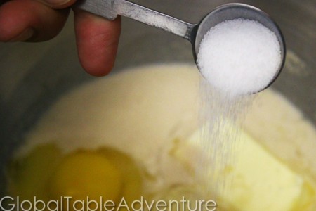 - In the bowl of a standing mixer, combine milk and yeast. Let sit and froth up for about 10 minutes. Add in sugar, eggs and softened butter.