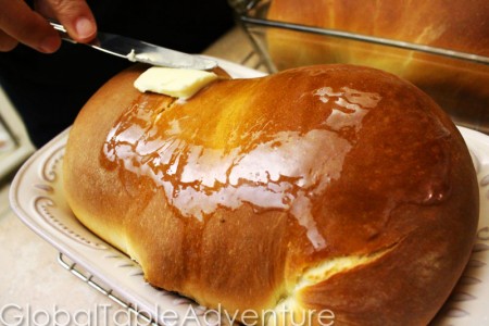 Bake 35-40 minutes, or until golden brown. While still warm, spread with butter.