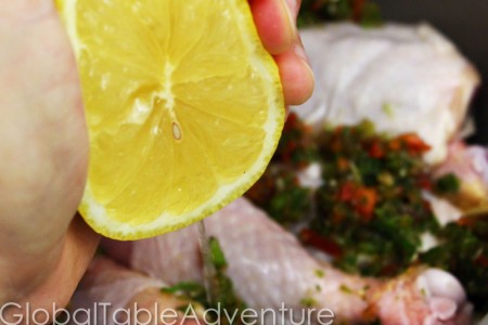1. Add chicken to a large bowl and toss with sofrito and lemon juice. Let marinade about 30 minutes (overnight is fine, too)